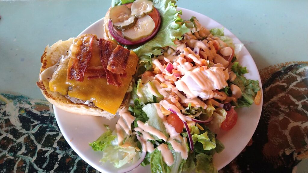 なお付け合わせはサラダ(タコサラダ、グリークサラダまたはシーザーサラダ)、フレンチフライ、サツマイモのフライ(Sweet Potato Flies)の中からひとつ選ぶことができます。ハンバーグはボリュームがたっぷりなので、筆者が訪れた2026年3月にはグリークサラダをチョイス。サラダは新鮮でオリーブが美味でした。